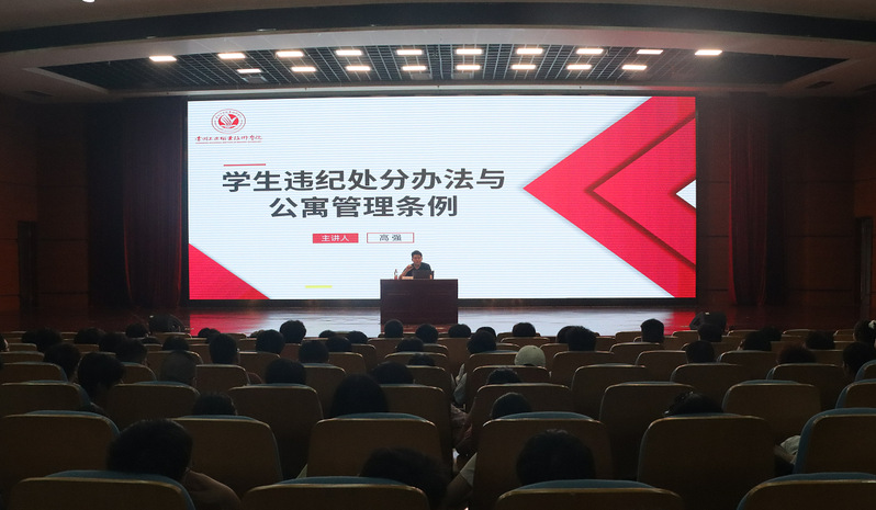 高强重点围绕安全教育和学生违纪处分办法等相关学生管理制度进行解读,分别从学生管理规定、学生行为准则、违纪处分规定等方面,结合近年来校内外发生的典型案例,让同学们更加直接、透彻地了解我校相关规章制度。