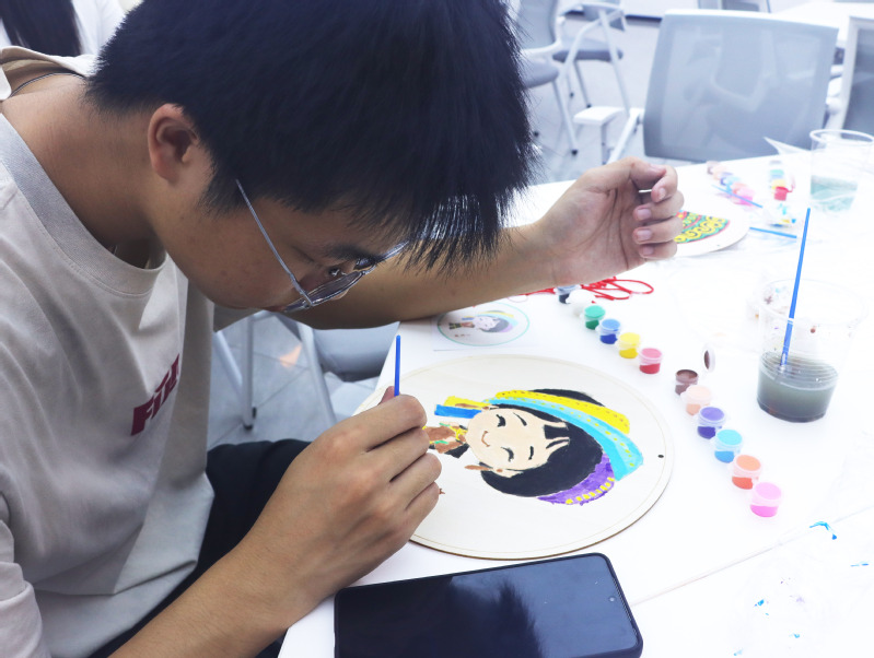 在民族风主题挂饰制作环节,同学们充分发挥创意,先在圆形木盘上精心绘制各少数民族人物画像,然后系上亲手编织的中国结,组装成独具特色的民族团结主题挂饰,每个挂饰都展现一个民族的特色服饰和文化符号。“此次活动十分有新意,不仅让我提升了绘画技能,更深入了解了各民族的文化特色。”参加活动的土家族学生杨鑫宇在展示作品时说道。
