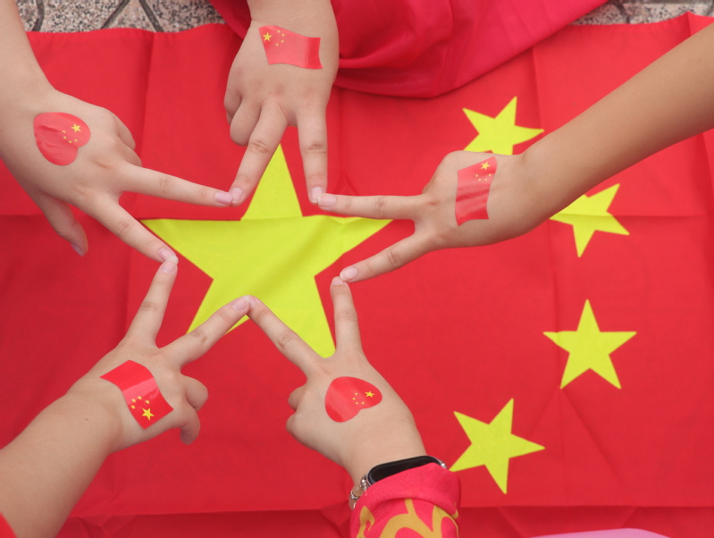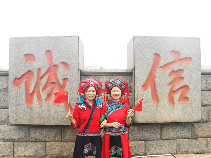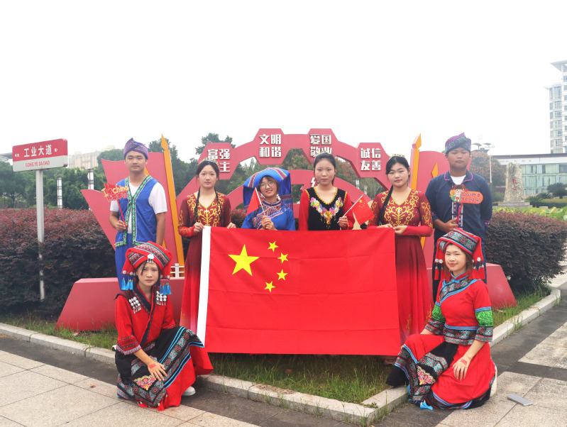 在“我与国旗合张影”创意摄影活动中,同学们身着各具特色的民族盛装,与鲜艳的五星红旗创意同框。壮族学生身着绚丽的民族服装,手举祝福祖国的标语牌和小国旗;土家族学生身着传统织锦服饰,在国旗下欢快展示摆手舞的独特韵味。同学们还自发组成“同心圆”队形,寓意各民族像石榴籽一样紧紧抱在一起。这些充满创意的合影,既展现了各民族文化的丰富多彩,又表达了各族青年对祖国的深厚情感。