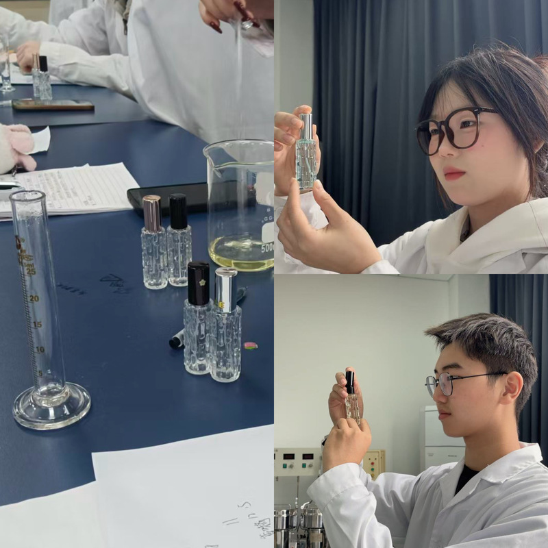 在活动中,大家分为四组,在老师的安排下制作对应的香水,选用不同的本草香精,有“大地”“蔚蓝”“小苍兰”等多种香型可供选择,教室里弥漫着的不仅是香味,更是同学们认真制作的“学”味。制作时,先加入了适量本草香精,接着又加入了香水溶剂和定香剂,最后灌装、检验,我们的香水就大功告成了!现场的香味交织,成为本草与香氛碰撞的独特注脚,在气味的留存中,延续着这场传统与现代的植愈之旅。本次活动寓教于乐,不仅将专业技能与实际操作结合起来,而且具有独特的趣味性与合作性,更让传统本草走进同学们的生活中,一举多得!