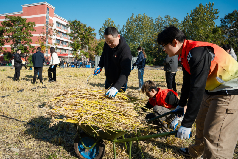 在基地负责人于涌杰博士的指导下,师生们手持镰刀,俯身踏入金黄的稻田,认真学习割稻、捆扎、搬运等操作。汗水浸湿了衣衫,泥土沾满了双手,但现场气氛热烈,欢声笑语与稻浪翻滚的声音交织成一曲动人的劳动赞歌。同学们在亲身实践中,真切体会到了“谁知盘中餐,粒粒皆辛苦”的深刻内涵,对劳动创造价值有了最为直观和深刻的认识。“这不仅是一次简单的农事体验,更是一堂生动的思政课。”材料工程学院党总支书记嵇天培在活动现场表示,“我们希望通过这种‘接地气’的方式,让同学们在劳动中磨炼意志、锤炼品格,培养艰苦奋斗的精神,同时将专业所学与国家战略需求相结合,践行新时代青年的责任与担当。”