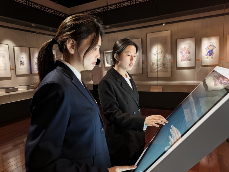 同学们依次参观了“史河流韵”与“春秋淹城”展厅,从新石器时代的玉器和石器到春秋时期的独木舟,全面了解了武进地区从古至今的社会变迁与人文积淀。在“春秋淹城”展厅,一座气势恢宏的遗址复原沙盘吸引了学生们的目光。这座全国唯一保存完好的春秋时期地面城池遗址,让同学们对先民的智慧与工匠精神有了深刻体会。学生党员钱俊辰感慨道:“面对这些珍贵的文物,我深刻感受到古人精益求精的工匠精神。一寸缂丝需耗费一日心血,一件华服需半年织就,这种执着专注的匠心让人敬佩。”临展厅内的年画同样吸引了学子们的目光。这些年画展现了深厚的民间艺术积淀,体现了中华优秀传统文化中的思想观念和人文精神。