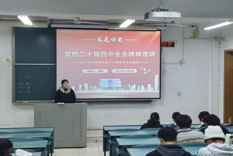 为引导青年学生深刻领会、准确把握党的二十届四中全会精神的丰富内涵与核心要义,12月2日,材料工程学院在知行楼举办了学习贯彻党的二十届四中全会精神专题宣讲会。会议由学院辅导员曹越主讲。