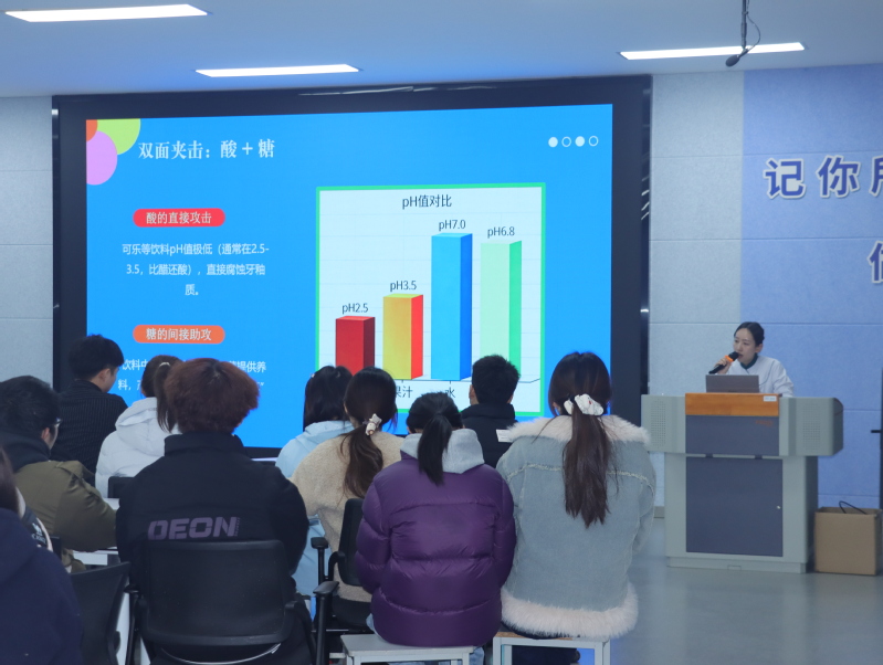 本次活动突破传统宣讲模式,从材料化学的专业视角出发,带领同学们深入探索口腔微环境与修复材料的科学奥秘,实现科普赋能与实践育人的深度融合。讲座并未止步于常规护齿知识,而是从“口腔化学环境”这一微观角度切入,生动阐释了牙齿是如何在日常饮食的“酸碱攻击”下经历“脱矿”与“再矿化”的动态博弈。在补牙材料科普环节,专家重点介绍了现代齿科修复中广泛使用的复合树脂材料,讲解其作为由有机树脂基质、无机填料及偶联剂构成的高分子复合材料,在光照固化过程中的化学机理与粘接特性,使大家从材料科学角度理解了牙科修复技术的进步。