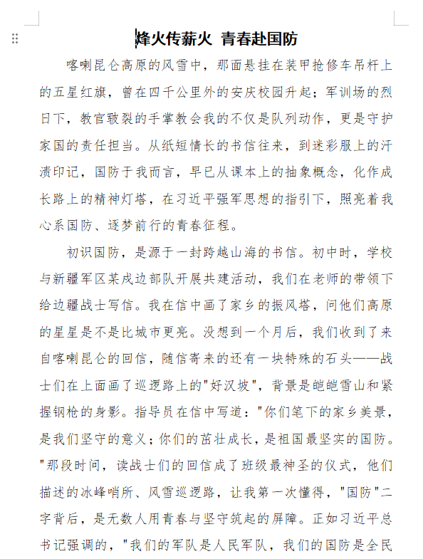 本次征文大赛得到了学校新生的热烈响应,同学们踊跃投稿,用文字重温那一段激情燃烧的时光。在一篇篇真挚动人的稿件中,有对教官严厉与关怀的深情回忆,有对踢正步、站军姿时挑战自我的生动刻画,有对集体生活中互助友爱的温暖叙说,更有对“坚持”“团结”“责任”与“爱国”这些词汇的全新理解与升华。字里行间,洋溢着青春的朝气,闪耀着思想的光芒,展现了新生昂扬向上的精神风貌。