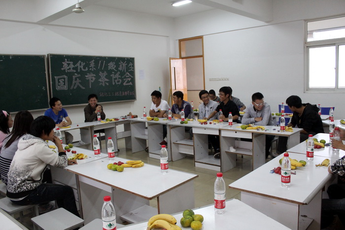 2011年9月30日 下午2:00,轻化系在工训楼404举行了国庆在校新生茶话会。系辅导员张宏老师出席了茶话会并带去了全系所有教师对各位新生的关爱和祝福。茶话会进行了两个多小时,辅导员老师和广大新生进行深入的交流沟通,学生们纷纷积极发言,现场气氛轻松、愉快、热烈。