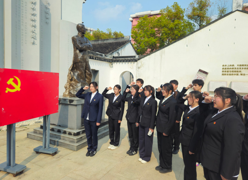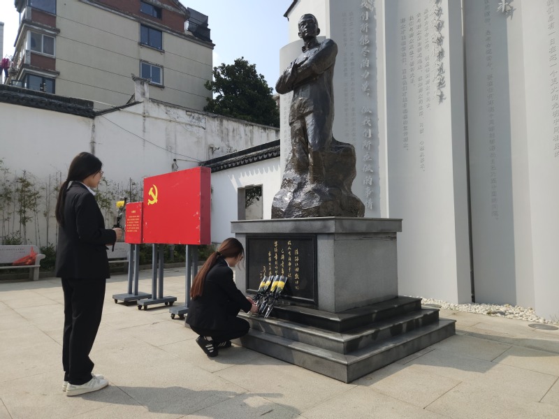 活动现场,在纪念馆工作人员的带领与细致讲解下,青年学子依次参观展厅,通过珍贵的历史照片、文献资料与实物展品,深入了解恽代英同志为民族解放、革命胜利不懈奋斗的英勇事迹,真切感受他坚守信仰、对党忠诚、不畏牺牲的革命精神。讲解过程中,同学们认真聆听、驻足思索,深刻体会革命先辈为国家和人民抛头颅、洒热血的赤子丹心,接受了一场深刻的红色精神洗礼。祭奠仪式庄重肃穆,全体人员怀着崇敬的心情,在恽代英同志雕塑前整齐列队,低头默哀,深切缅怀革命先烈的不朽功勋。随后,同学们依次上前,郑重献上鲜花,表达对先烈的无限敬仰与深切哀思。默哀献花仪式结束后,学生党员和入党积极分子面向党旗,重温入党誓词。铿锵有力的誓言在纪念馆广场上回荡,彰显出青年学子传承先烈遗志、勇担时代重任的坚定决心。